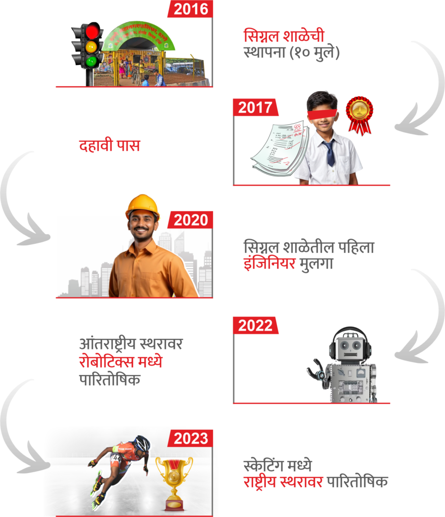 • सिग्‍नल शाळेच्‍या व्‍यवसाय प्रशिक्षण केंद्रात प्रशिक्षित झालेले ६ विदयार्थी आता फॅब्रीकेशनचा स्‍वतंत्र व्‍यवसाय करू लागले आहेत.